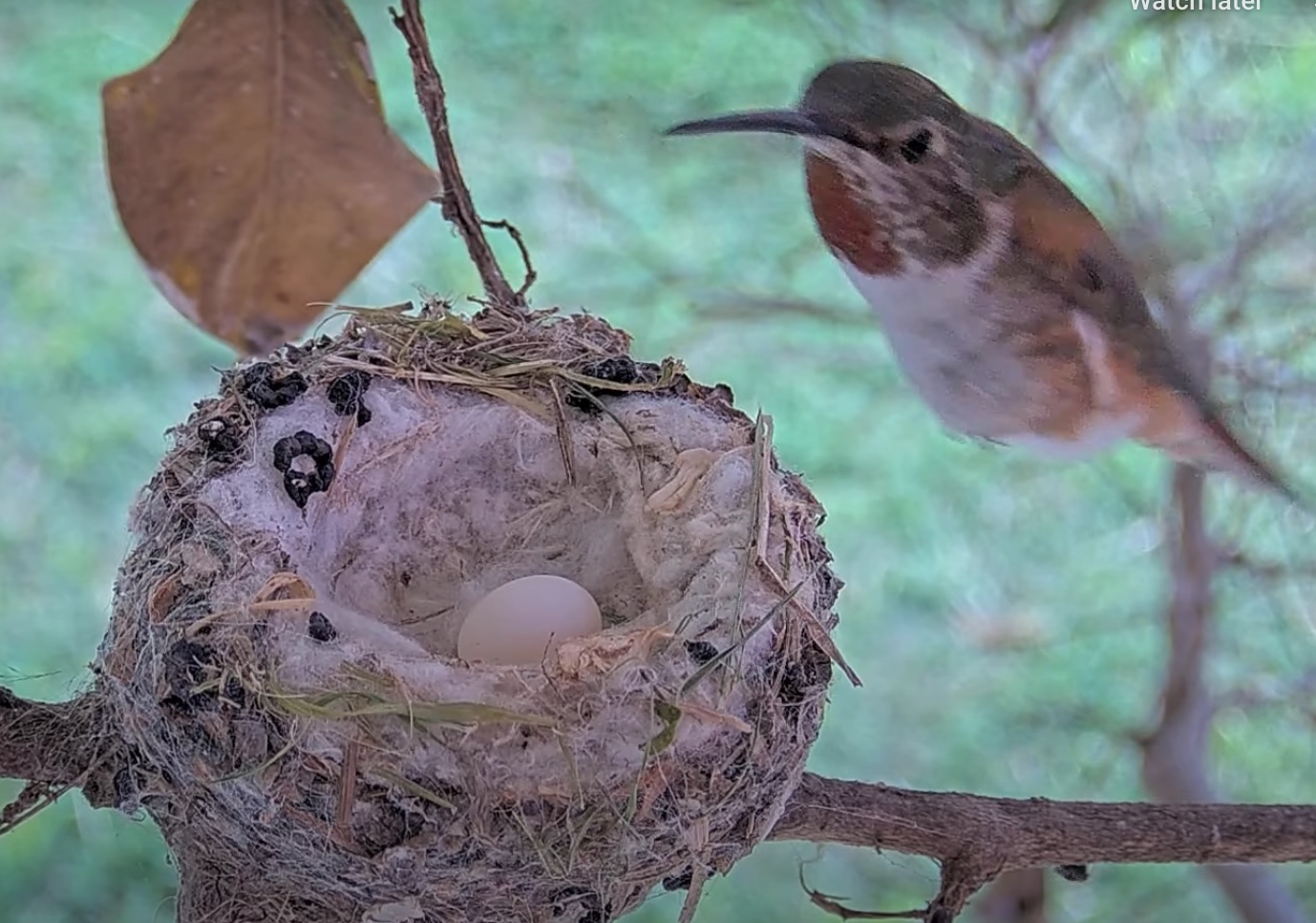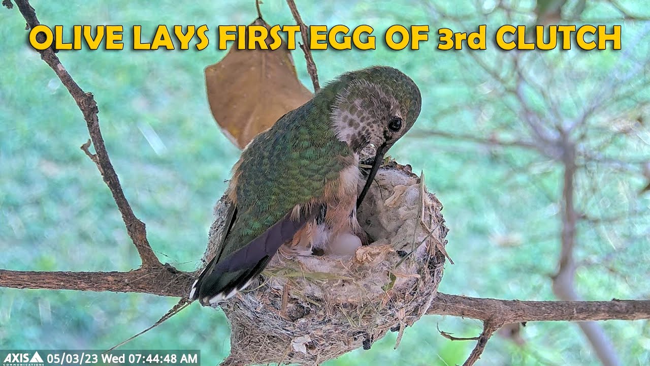 1st Egg Video – Olive the Hummingbird May 3, 2023 julie Noticed egg in nest 8:22am 5/3. This is Olives 3rd clutch of the season. Hummingbird Nest Cam