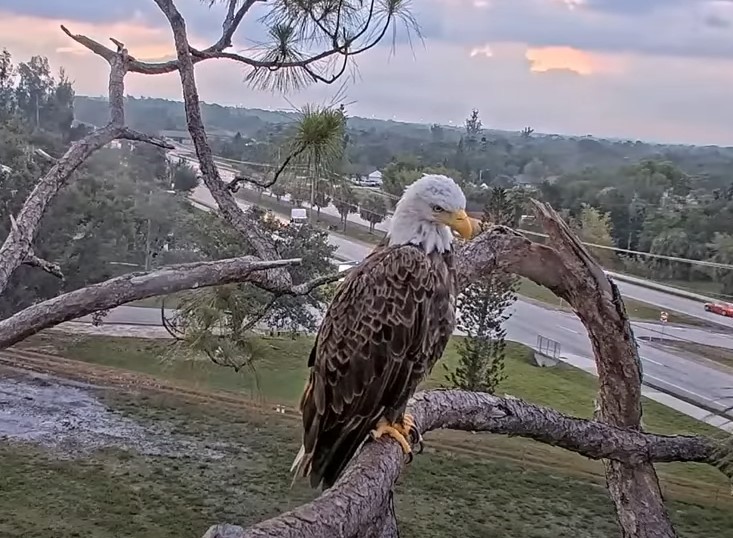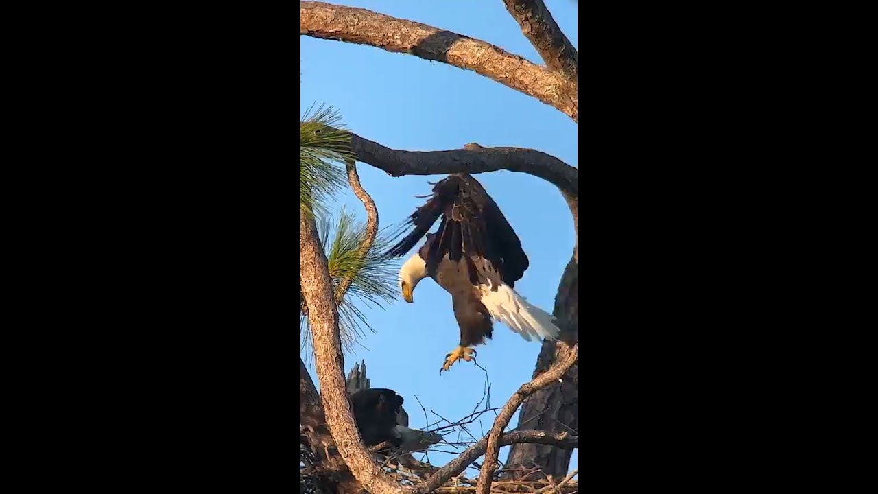 Perched up in the nest yesterday(9/10/23) M15 offered food to his “girlfriend”. She accepted it, protecting it with her wings while eating. While she was busy eating he decided to bring in some sticks and do a little nest restoration.
