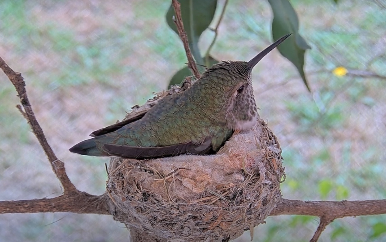 The nest looks to be complete and now we wait for the first egg. She has been in and out a lot today testing the nest to make sure it fits “just right”. Hummingbirds like Olive usually always lay two eggs and incubate for about 14 days starting after the last egg is laid. We should be seeing the 1st egg very, very soon!