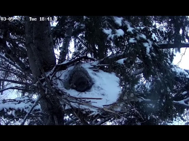 Albert(Male) came into the nest yesterday evening. He decided to do some snow removal and then flew off. They have been visiting more frequently. You can hear Ellie(Female) hooting in the background. Hopefully we will see an eggie soon! 🥰