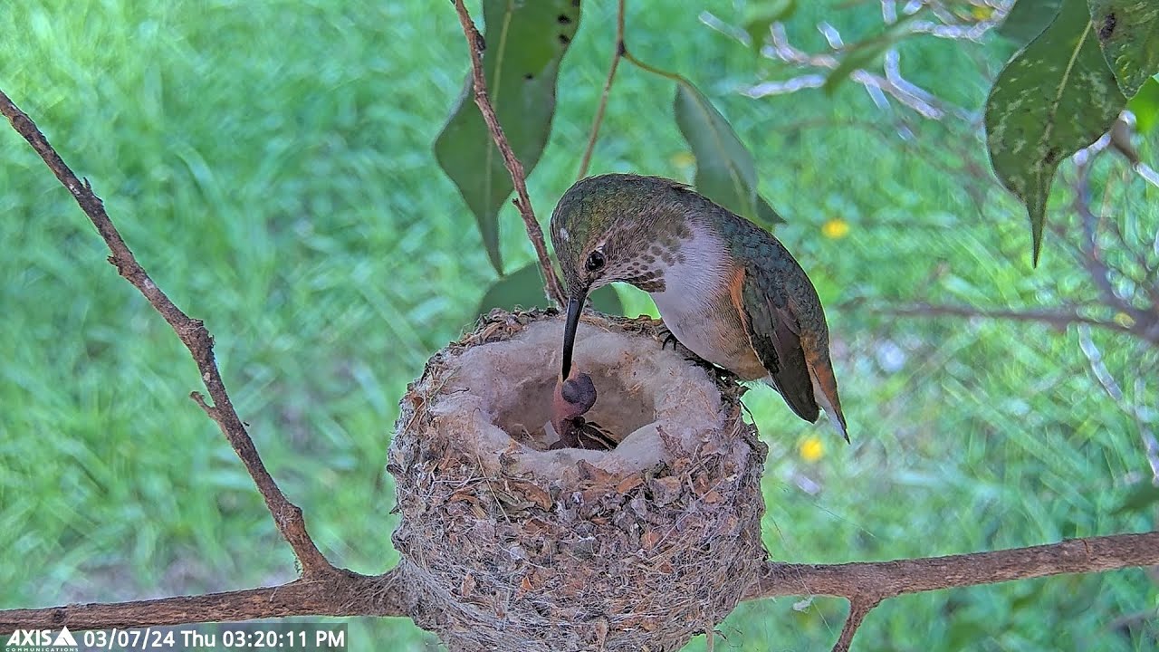 Well today is the day! The first egg hatched at around 10:30am this morning(camera time). The 2nd egg should hatch today too. In this video you will see the first feeding of the newly hatched hummingbird baby.
