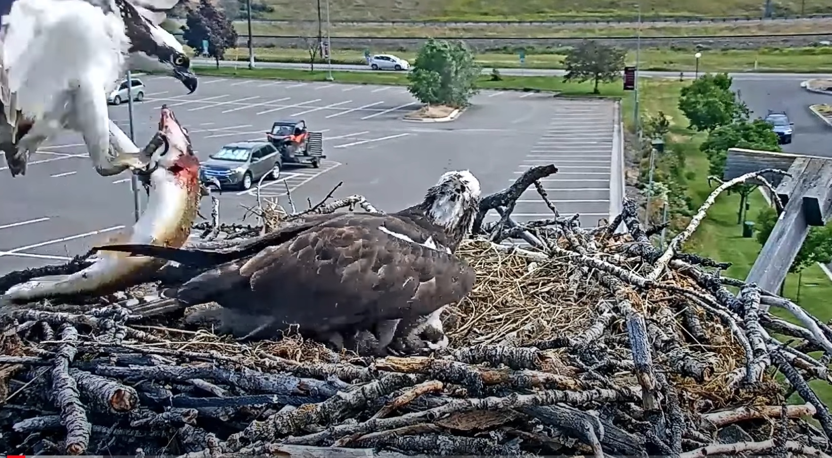 This feeding frenzy lasted about 40 minutes. After ensuring the chicks were well fed, Finnegan reclaimed the remaining fish and took off with his share.
