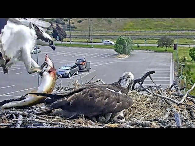 In the Hellgate Osprey nest, a fascinating sequence of events unfolded. Finnegan, the male Osprey, secured a hefty catch and brought it home to his brood. Iris, the mother, snatched up the fish, proceeding to feed her chicks to their fill.