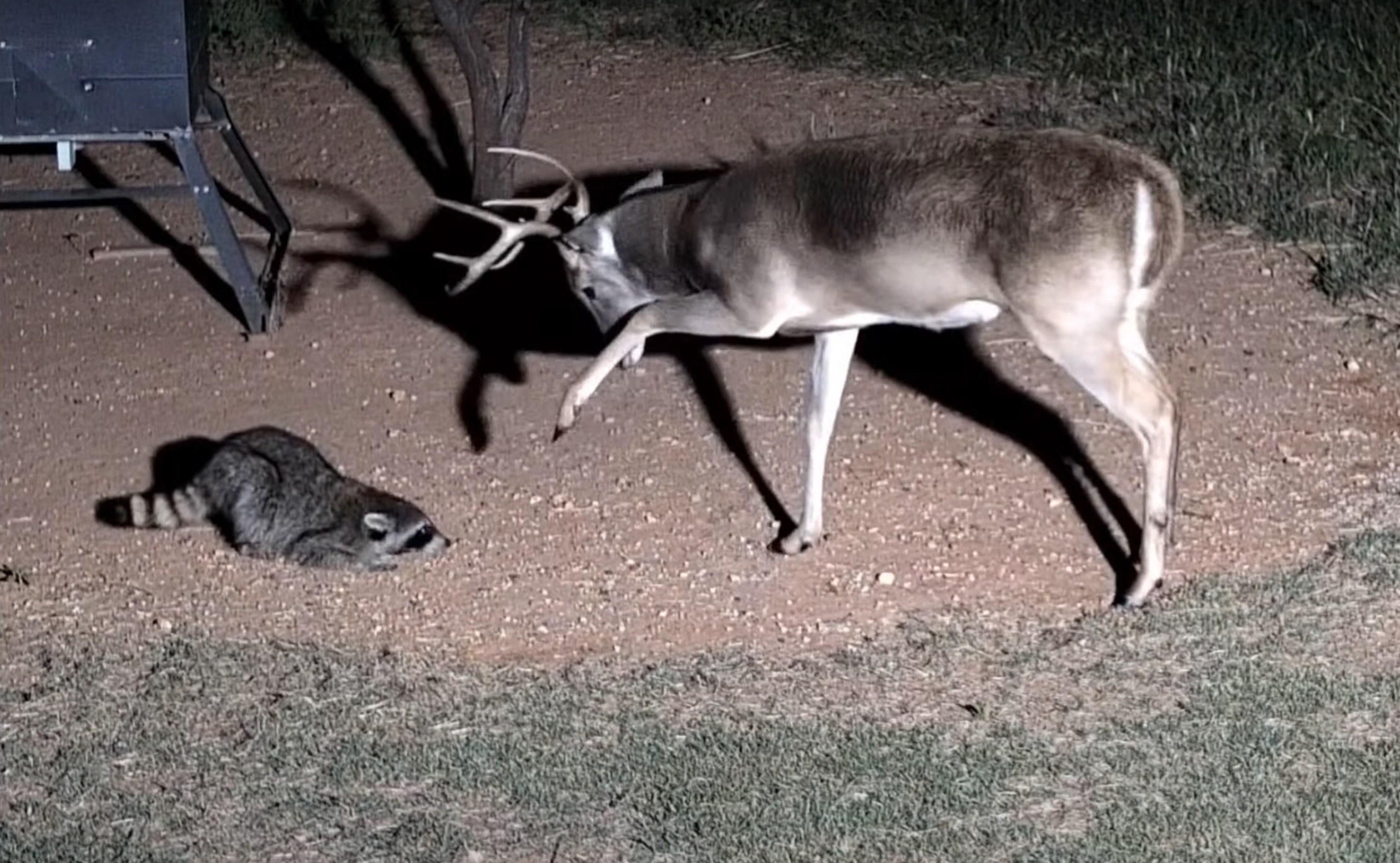 Deer Drama Unfolds! In a recent wildlife video, an 8-point whitetail buck was spotted enjoying a peaceful meal at the feeder. But the tranquillity didn’t last long! Suddenly, a raccoon made its entrance, much to the buck’s displeasure. The buck, protective of his meal, took it upon himself to teach the raccoon a lesson. He lowered his rack and charged! But the raccoon was no pushover. Rather than fleeing, it went full defense mode, slowly retreating under the feeder, where the buck couldn’t reach him. 😆