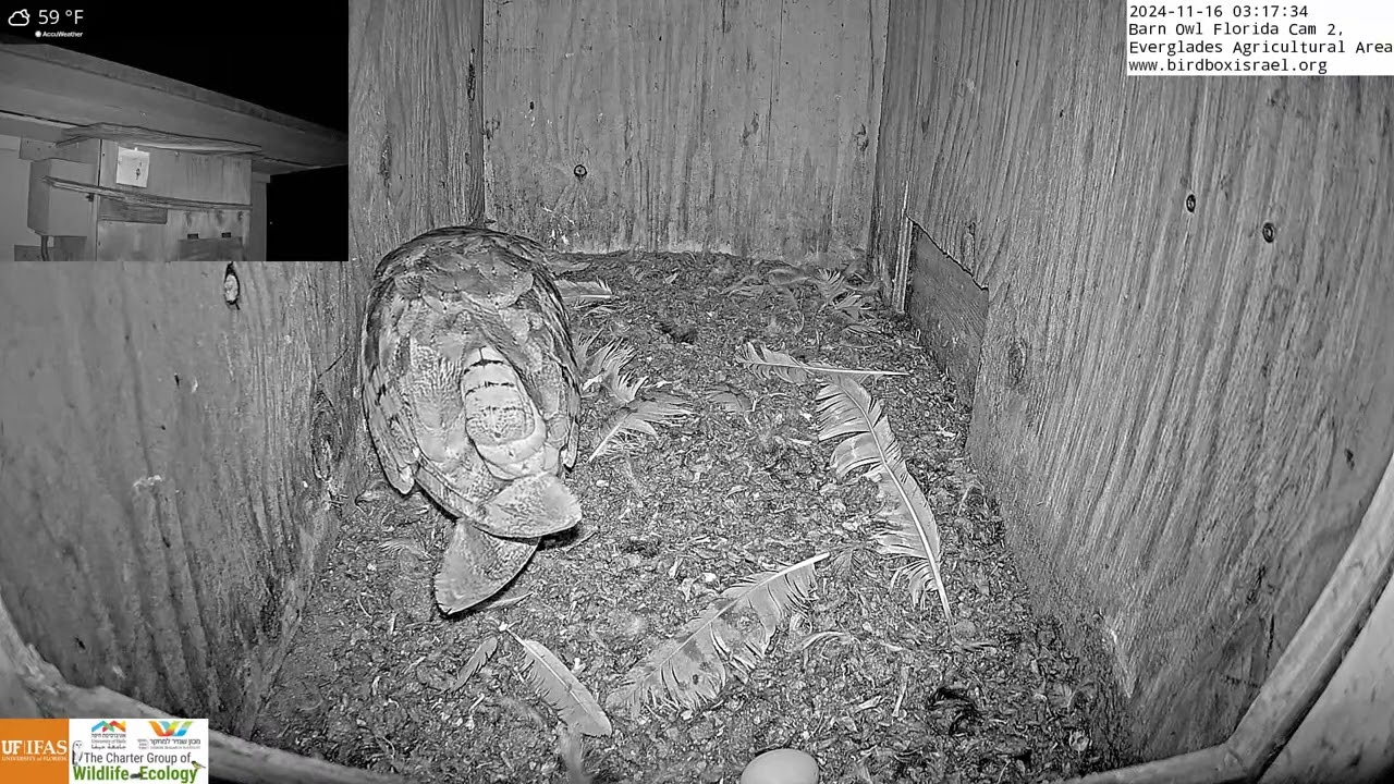 The first egg for the nesting season was laid late last night(November 15th). Barn Owls start incubation after the 1st egg is laid. We can anticipate a hatch around December 10th 2024.