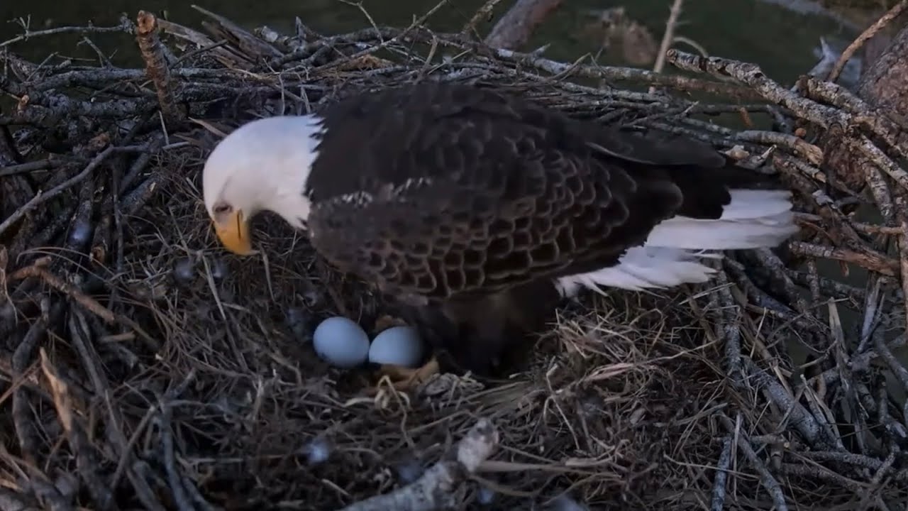 A lot happens in this 15 minute video! You will see a change of guard with M15 taking over the evening incubation. Then F23 flies over to the pond and takes a drink. From that she flies up to the nest and a close-up preening session ensues. There is also a good amount of chatter between the two while all of this is going on.