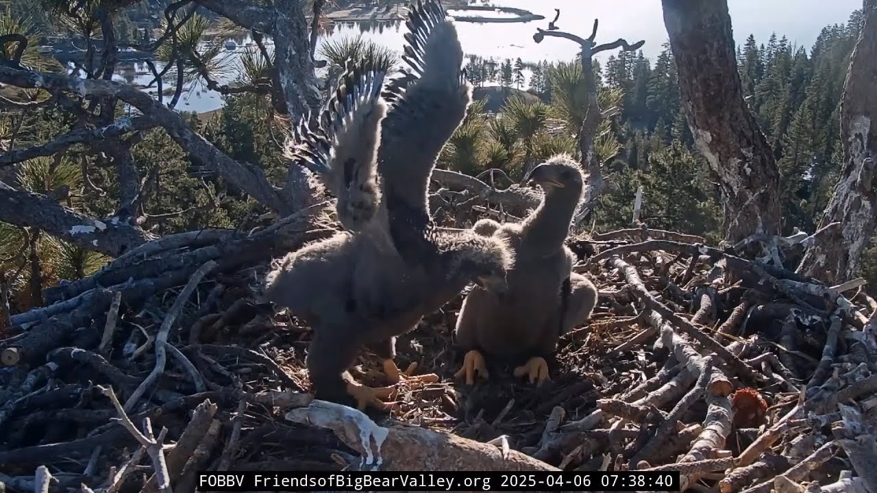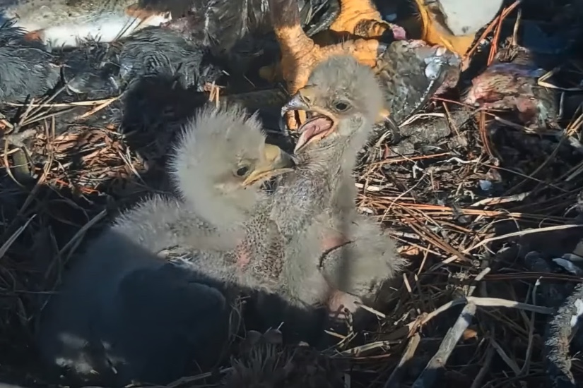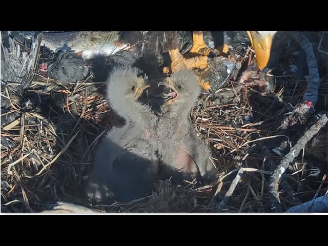Sibling bonking is common in raptors. Older dominant chicks usually eat first, while younger chicks use clever tactics to get food, such as stealing or feeding when the older sibling is distracted. This rivalry ends once the pecking order is set. More food in the nest reduces bonking and dominant behaviors. In this video you will see the youngest chick try to assert dominance by bonking the older one. This little chick is determined! In the end both chicks got plenty of food from Jackie and as you will see through the video their crops keep getting fuller and fuller.