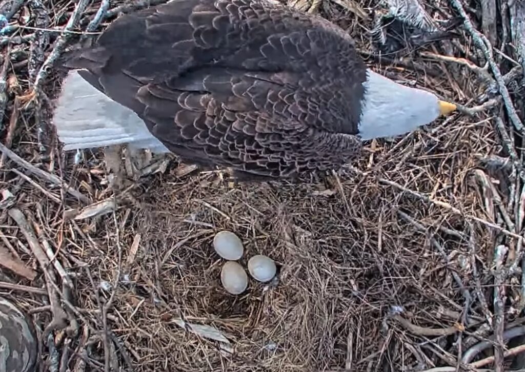 It’s been 33 days of incubation for the first egg as of today. Bald eagle eggs hatch after 34-36 days of incubation on average. This year I’ve been seeing quite a few bald eagle nest cams where the first egg has been hatching at day 37,38. Every nest is different. Things like the weather, food supply and quality of incubation can play a huge role in when the first egg hatches. We should see a hatch here at the ND Leef nest within the next 5 days. Be on the lookout for a PIP!