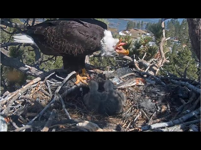 A fish that was brought in contained a hook and line. It’s not confirmed that the hook got embedded in Jackie, but the line looked attached to her. She then proceeded to shake her head and work on removing the object. After a few heads shakes you will see a fish hook and line go flying into the air. It’s not easy to spot. You need to slow down the video to the slowest playback speed and at the 7:48 mark keep your eyes focused between the two chicks heads. You will see the fish hook. It looked to me like the hook flew far enough out of the way so that it shouldn’t cause any more issues.