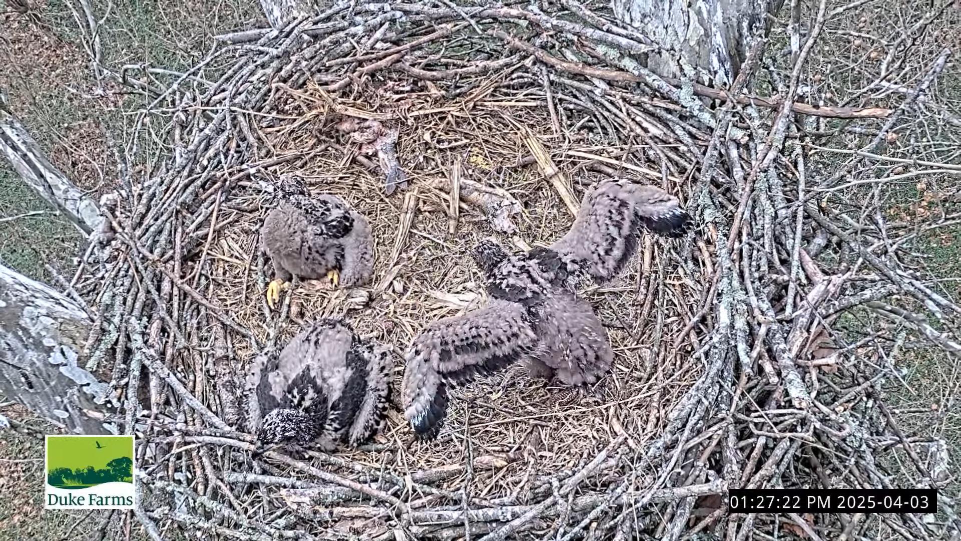 The Duke Farms eaglets will be six weeks old this week, marking the halfway point to fledging. At this stage, the eaglets are becoming more active, practicing standing, walking, and stretching their wings in preparation for eventual flight.