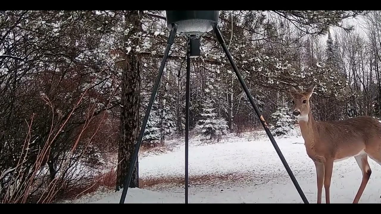 Three deer came in for a snack. Some peanut butter was placed on the deer feeder pole. It sure didn’t take em long to find it! As the video progresses you will notice that the deer must have gotten some peanut butter stuck to the roof of its mouth. 😆 There is also peanut butter on the big pine tree just behind the feeder to the left. I wonder how long it will taken em to find it. 😊