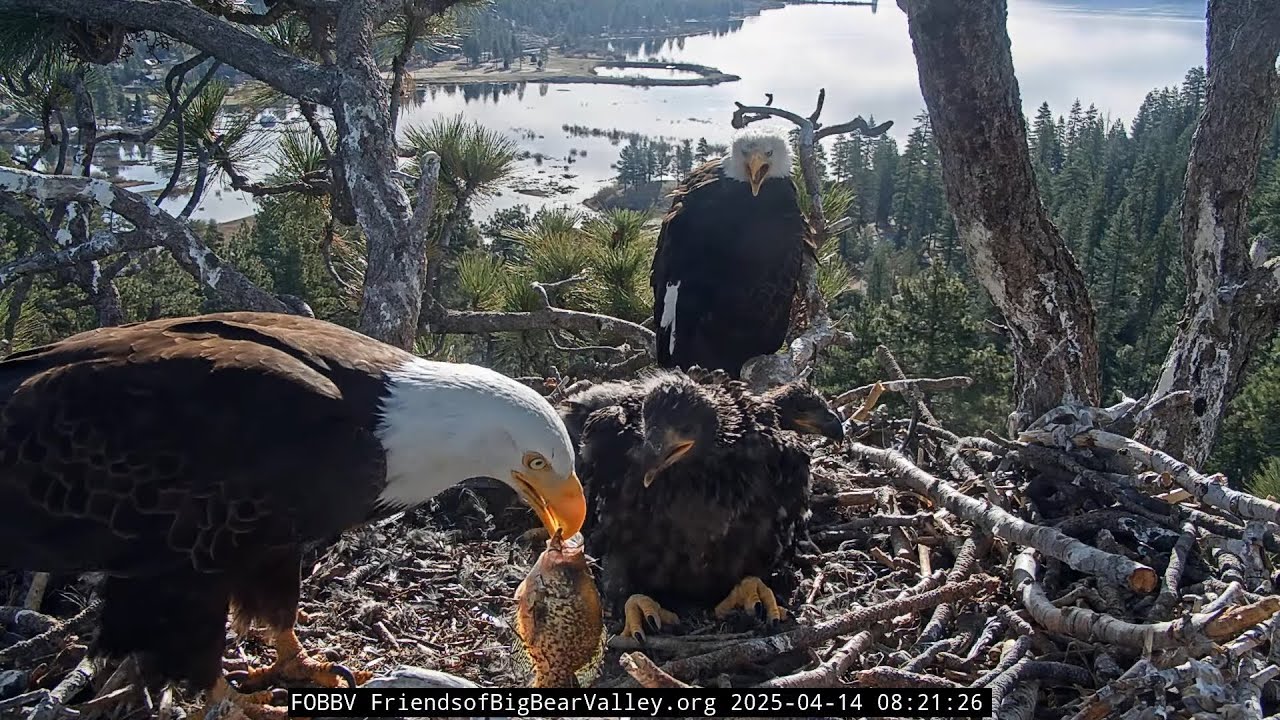 In this video you will see Shadow fly in with a crappie fish. He sets it down and then Jackie picks it up. You can see clearly there is fishing line wrapped up on the fish. It didn’t look like the fish had fishing line attached to it when Shadow flew in. So this line we see could be the existing line that’s been in the nest for a while now. You be the judge. Either way, Jackie took the fish and eventually they picked it apart. Everything seems fine, other than the fishing line being there.