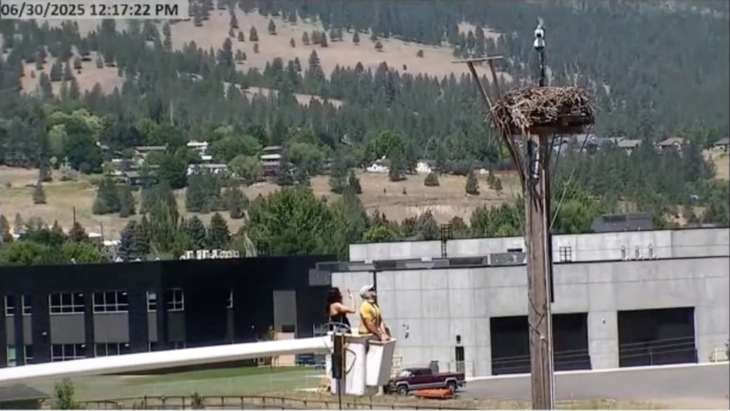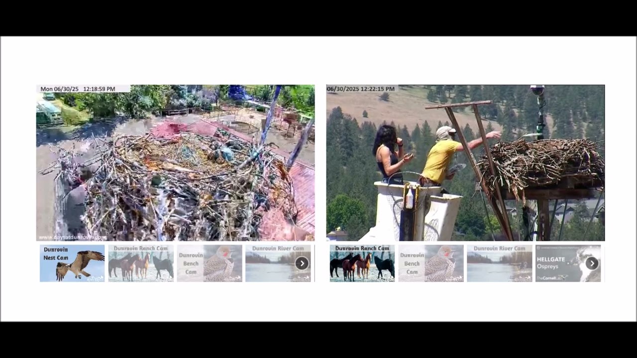 In this video you will see what is thought to be the oldest of 4 chicks lose its balance and fall out of the nest bowl. Luckily it got hung up on part of the outer nest structure, but was stuck. Rescue efforts went underway with a bucket truck and the chick was able to be saved.